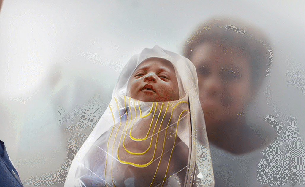 Light feedback indicates when to ventilate. Simple instructions on the blanket and graphic elements enhancing signs of the baby’s wellbeing, such as chest rise and colour, support the midwife in a stressful situation.